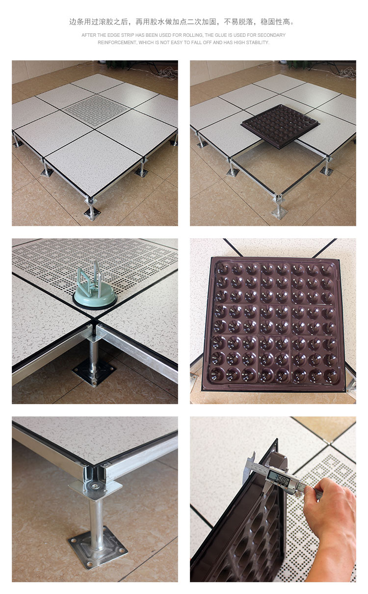 全鋼防靜電地板為全鋼組件,分有邊、無邊、微邊(三種邊處理方式)。底面采用SPCC深沖冷軋板拉伸成型鋼板厚度(0.4~1.5mm),球窩狀結構,增加地板的機械荷載強度。面板采用硬質SPCC鋼板(0.5~2.0mm),上下經(jīng)過點焊焊接成型,切邊沖孔后,經(jīng)防銹處理,環(huán)氧樹脂粉末靜電噴涂后,中間填充發(fā)泡水泥(可以根據(jù)客戶需求發(fā)泡不同重量),再經(jīng)過日曬養(yǎng)護后形成穩(wěn)定的承載結構。地板上表層粘貼防火板(HPL)/復合PVC/ 通體PVC/陶瓷地磚等不同材質的裝飾表層,達到產(chǎn)品花色的多樣性、可以根據(jù)客戶需求個性化定制產(chǎn)品。搭配聯(lián)網(wǎng)支架、支架、螺釘組裝后,定位聯(lián)接更加準確、精度可靠。