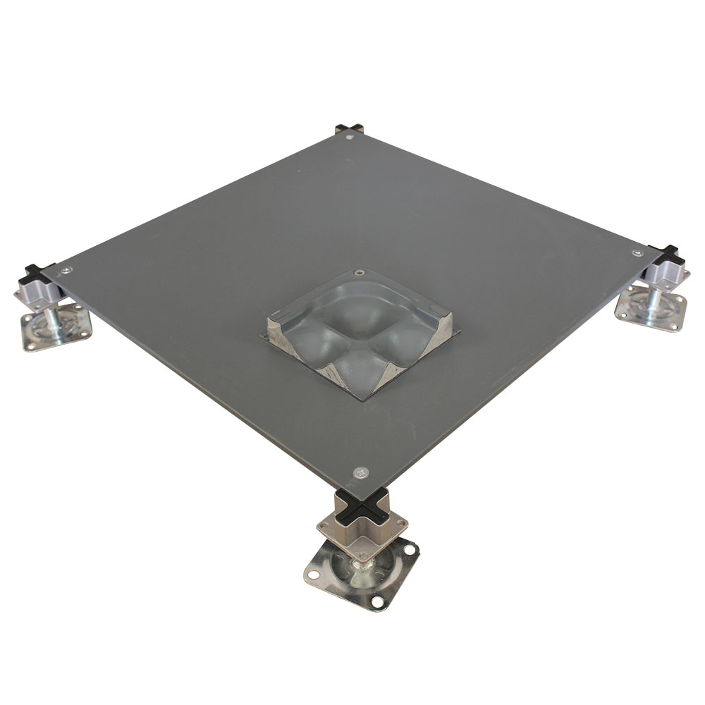 OA500網絡架空地板采用鋼板經拉伸成型、點焊、外表經防銹處理后進行靜電粉末噴涂處理,內腔填充發泡水泥,四角帶有角鎖孔。支架為冷軋帶鋼鋼板及鑄鋁合金鋁頭組成,可調節升降高度。由于智能化樓宇配線復雜,功能齊全,故出線口較多。